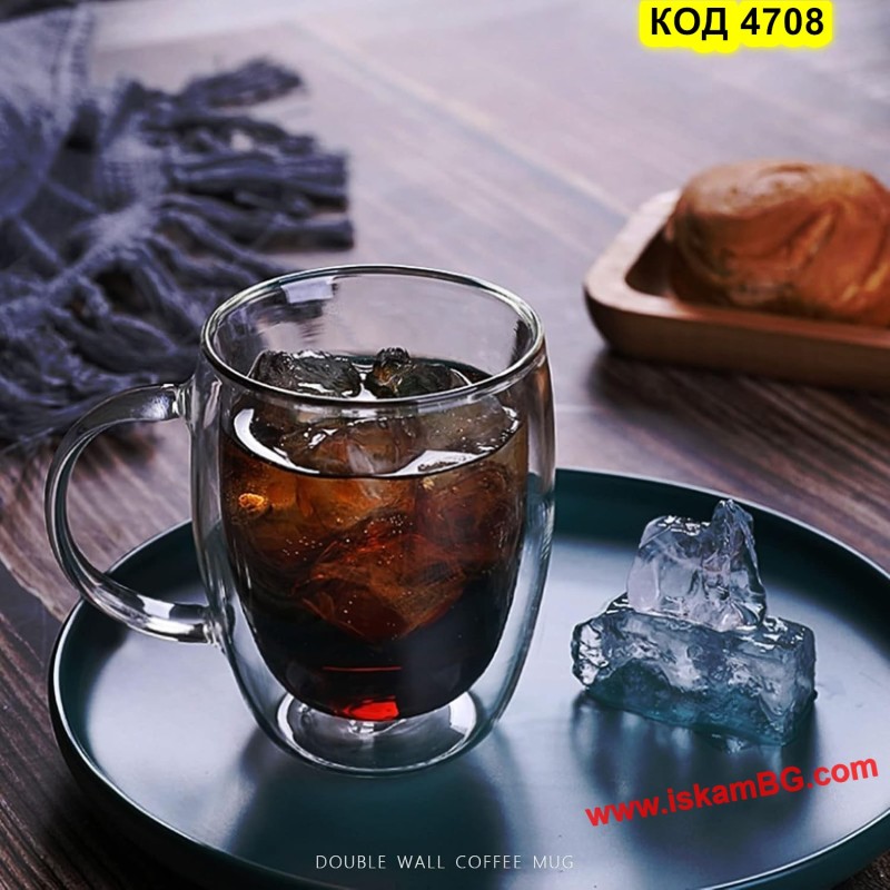Елегантна двустенна стъклена чаша с дръжка, създадена за максимален комфорт при пиене на топли напитки.
