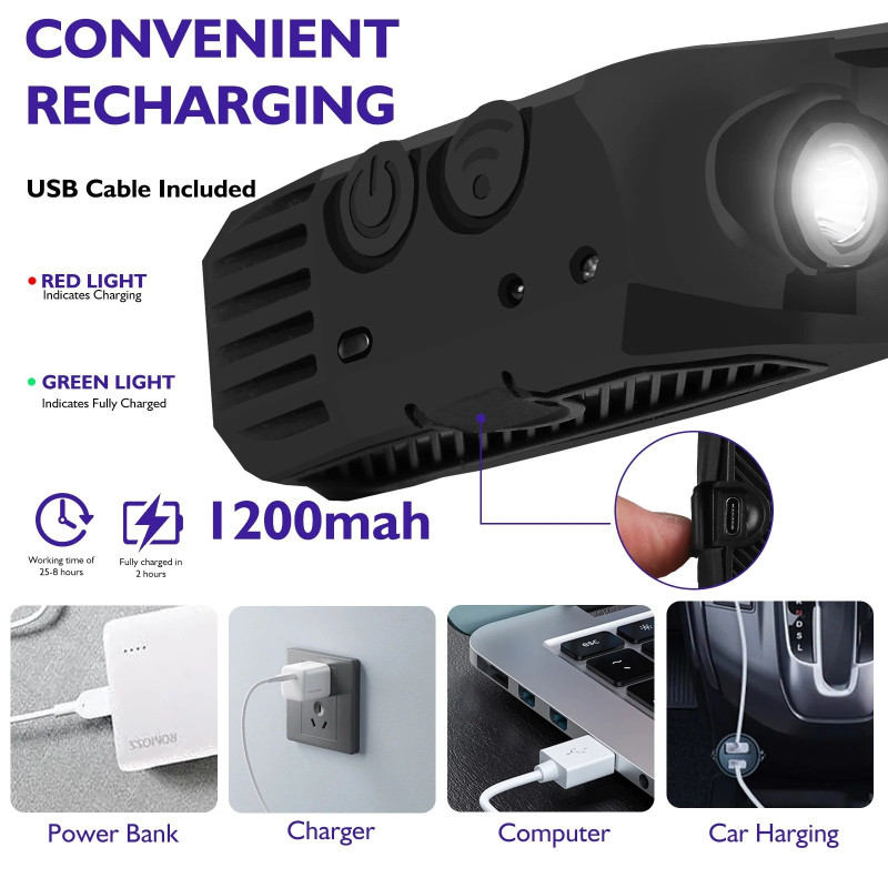 Вградената батерия от 1200 mAh издържа дълго време, челника се зарежда чрез включения USB кабел за зареждане, който може да се свърже към всеки USB порт. Само с 2 часа време за зареждане, акумулаторната лампа осигурява до 4 - 8 часа постоянна светлина.