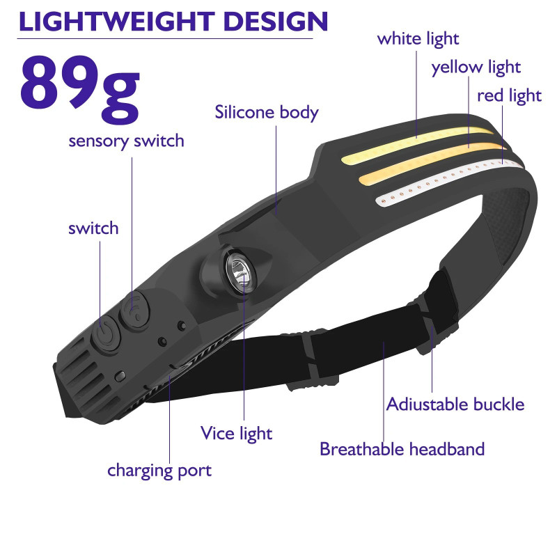 LED фенерчето може да достигне до 350 лумена. По този начин гъвкавата лента за глава може да създаде 230° широка зона на осветяване, на пътя е напълно ярка при ходене и работа.