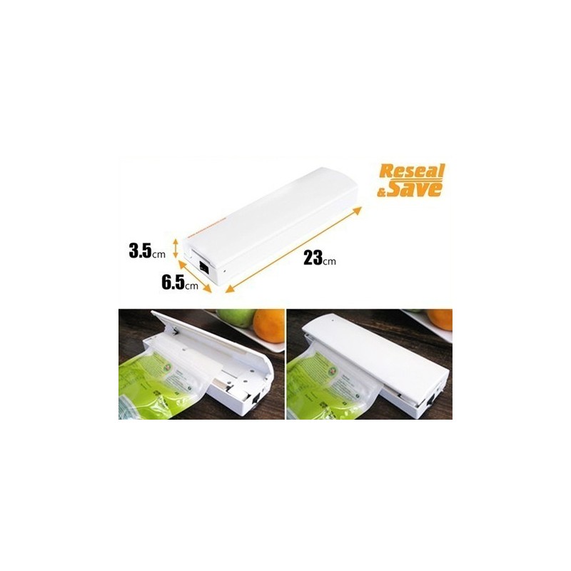Reseal and Save е иновативен уред за запечатване на всякакъв вид найлонови пакетчета и торбички. Този уред е перфектното решение за запазване на пресното и вкусно съдържание на хранителните продукти. Независимо дали сте спагети, макарони, бисквити, кейкове или бонбони, Reseal and Save ще ги запечата и запази свежи и хрупкави.