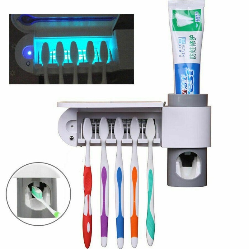 Този иновативен и ефективен многофункционален стерилизатор за четки за зъби предлага 3 важни функции - UV стерилизатор, поставка за четка за зъби и дозатор за паста за зъби. Поставката се закрепва към стената чрез лепяща фиксация и побира до 5 четки за зъби. Също така, тя е подвижна, което я прави много лесна за почистване.