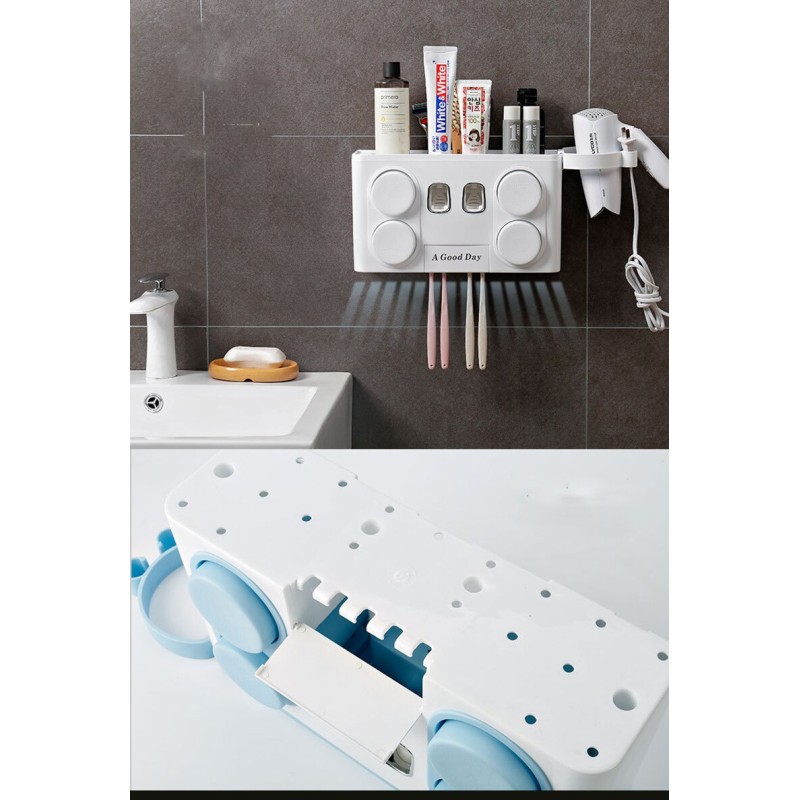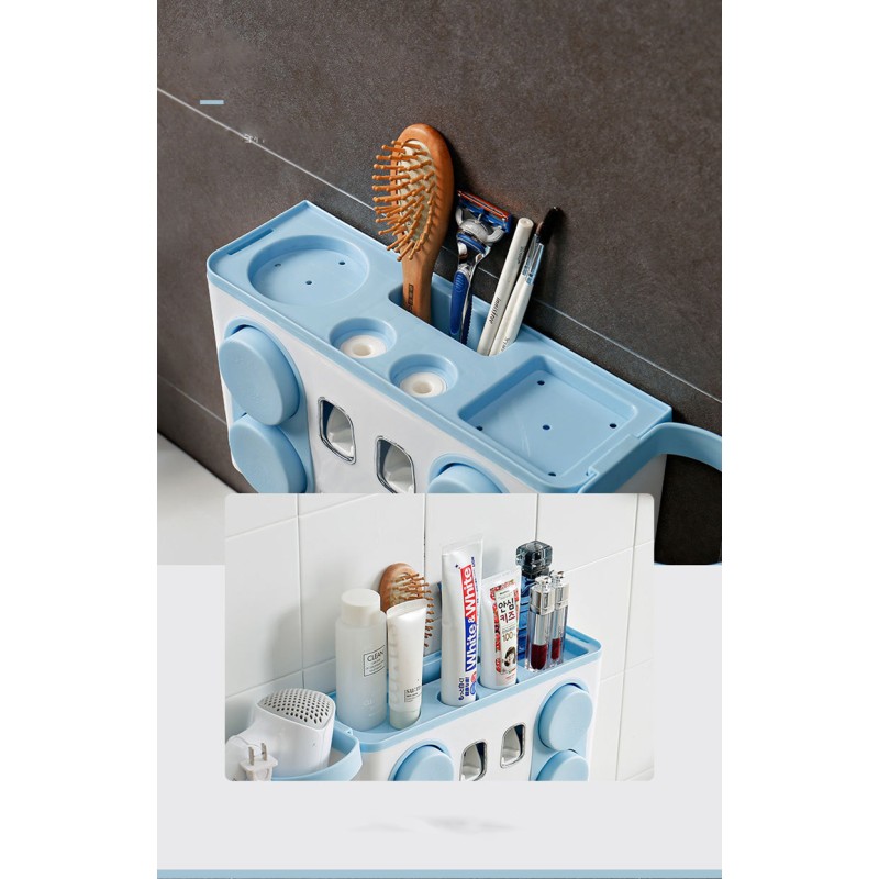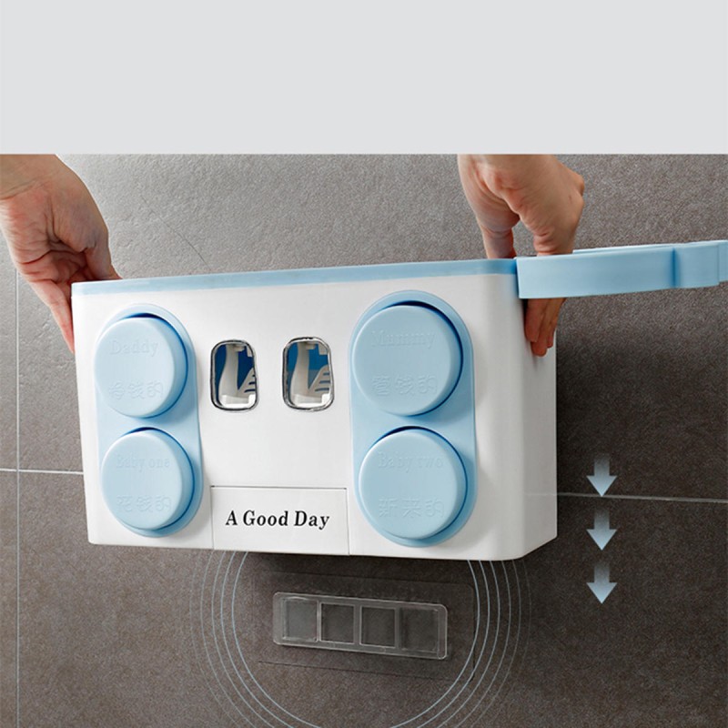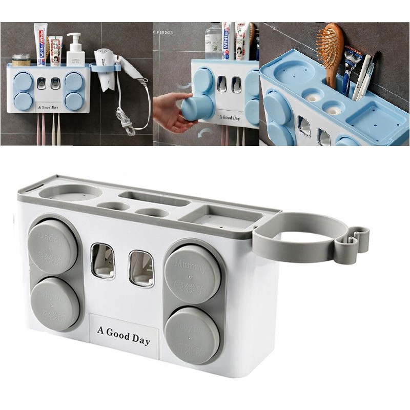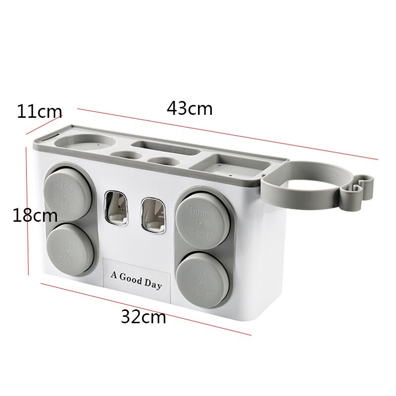 В долната част има поставка за 5 четки за зъби с предпазен капак. Така четките за зъби са лесно достъпни и предпазени от замърсяване. Когато пожелаете да си сложите паста, просто поставете четката в езичето на диспенсъра и натиснете.