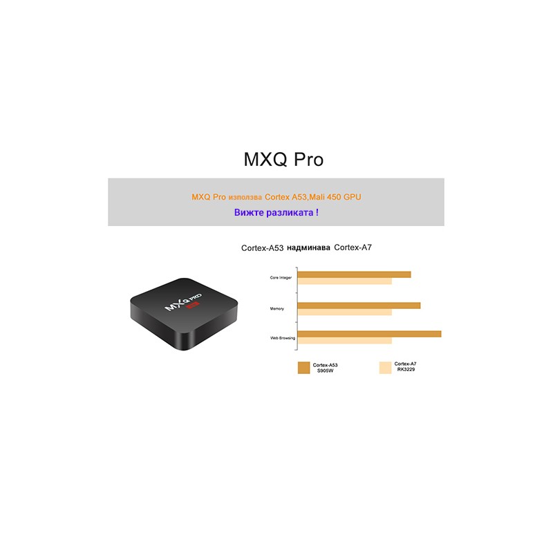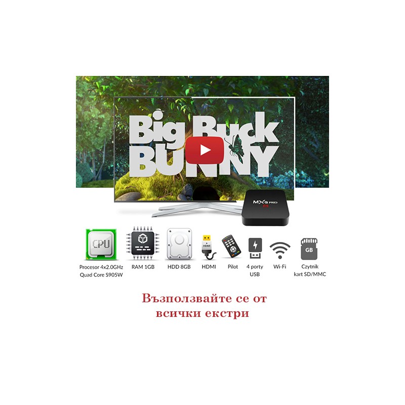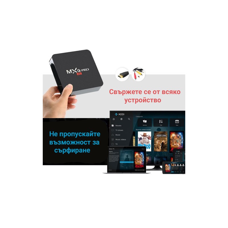 С ТВ бокса можете да влизате в Internet, да сърфирате в любимите си интернет сайтове, да гледате видео в YouTube, да ползвате безплатен медия център KODI (XBMC) ,да гледате безброй БГ ТВ канали и най -новите ФИЛМИ от приложения като " exodus", " 1channel" и много други!