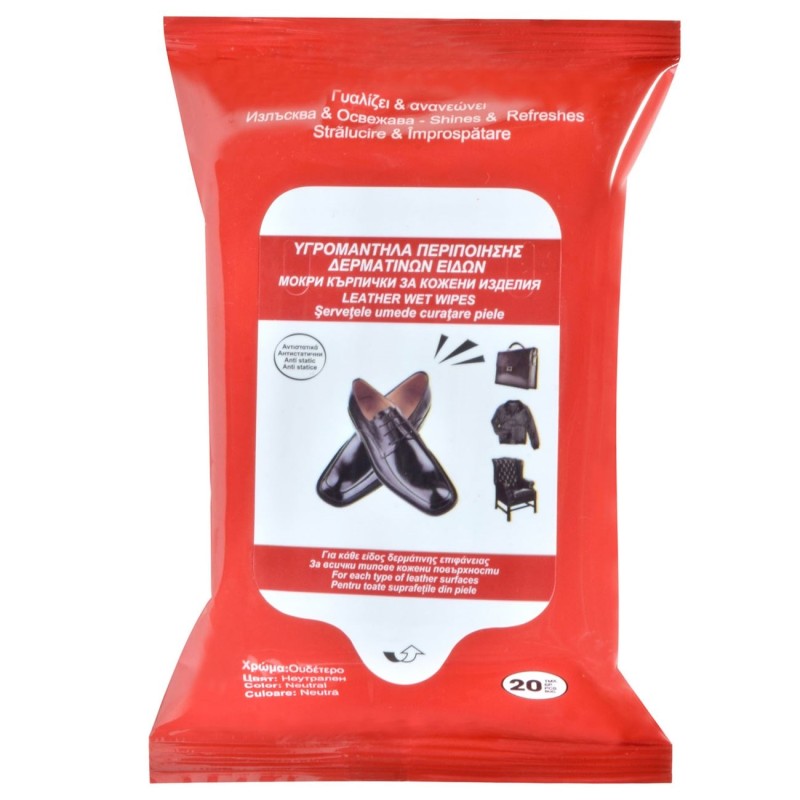 20 броя мокри кърпички в неутрален цвят за полиране и освежаване на всички видове кожени повърности.