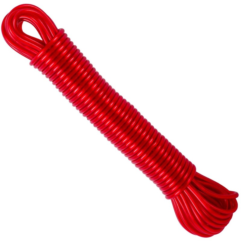 Въже за простор в червен цвят, изработено от здрава пластмаса, устойчива на атмосферни влияния и влага.