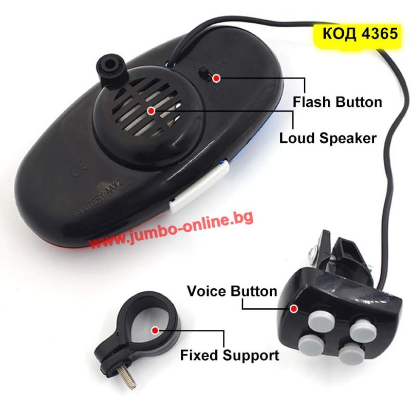 Разполага с вграден кабел за сирени, 2 специални скоби за сирената и една за дистанционното с бутоните, за да се монтира лесно на кормилото на велосипеда.