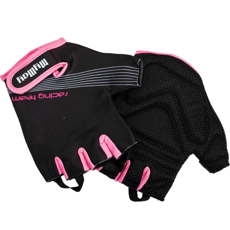 Дамски ръкавици без пръсти, предназначени за колоездене, изработени от абсорбираща материя и дишаща мрежа със стилен дизайн в черно и цикламено.
