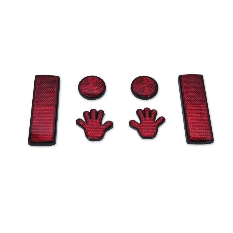 Комплект от 6 броя червени светлоотразители за велосипед - два кръгли с диаметър 3 см., два правоъгълни (9.3 х 2.8 см.) и два с формата на ръка (4.5 х 4 см.), изработени от здрава пластмаса.