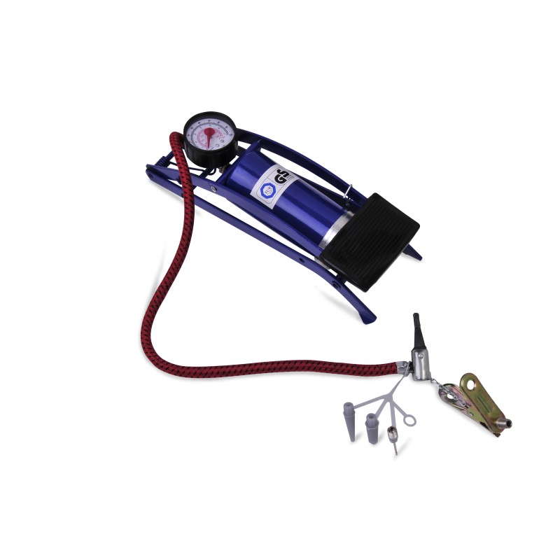 Многофункционална помпа с един цилиндър, въртяща се лесно разчетима скала и гумирани крака, осигуряващи стабилност.