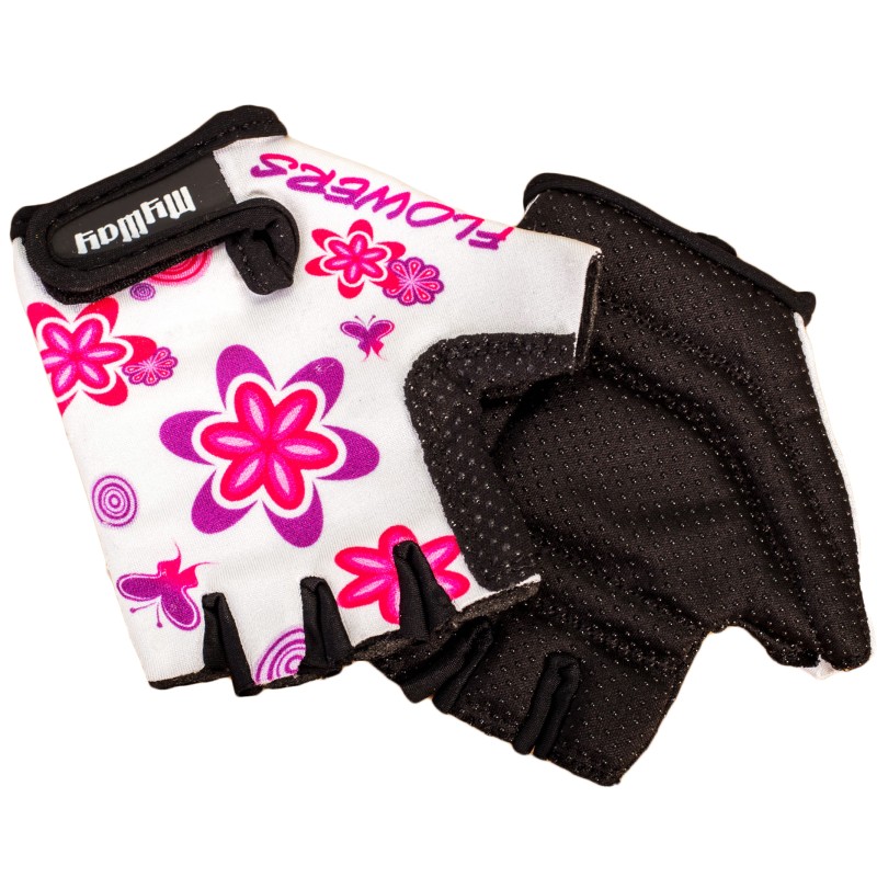 Детски ръкавици без пръсти, предназначени за колоездене, изработени от абсорбираща материя и дишаща мрежа с красив флорален принт в бяло и цикламено.
