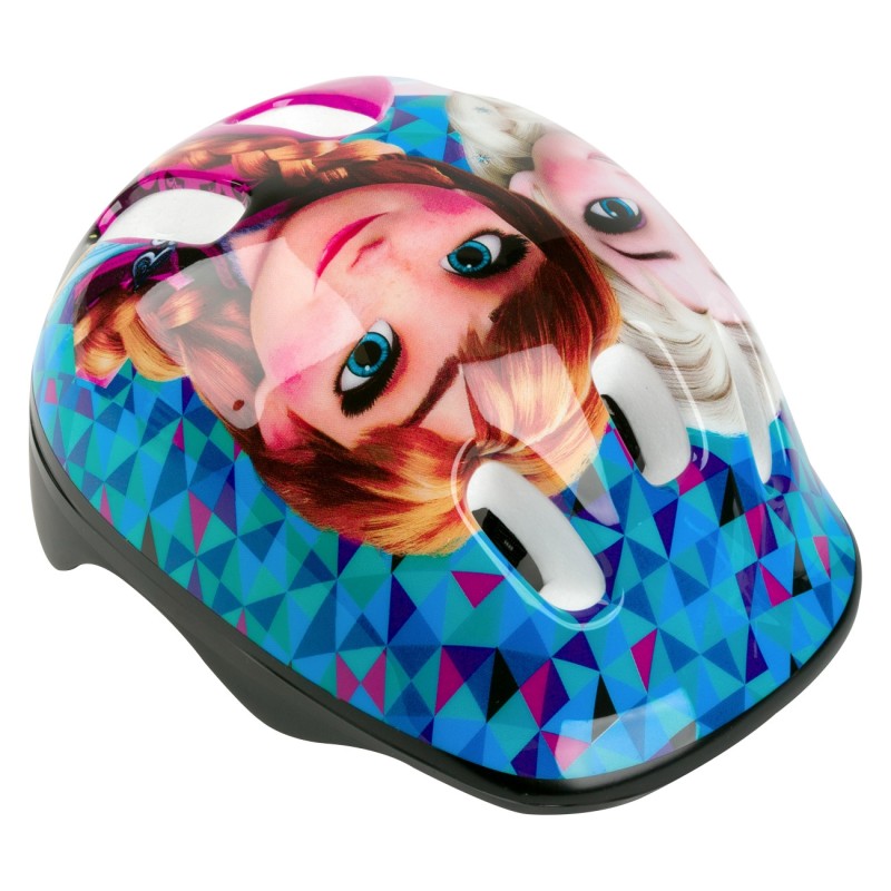 Детска каска за велосипед, изработена от устойчива и безвредна пластмаса в син цвят с красива цветна щампа на любимите героини от Замръзналото кралство - Елза и Анна.