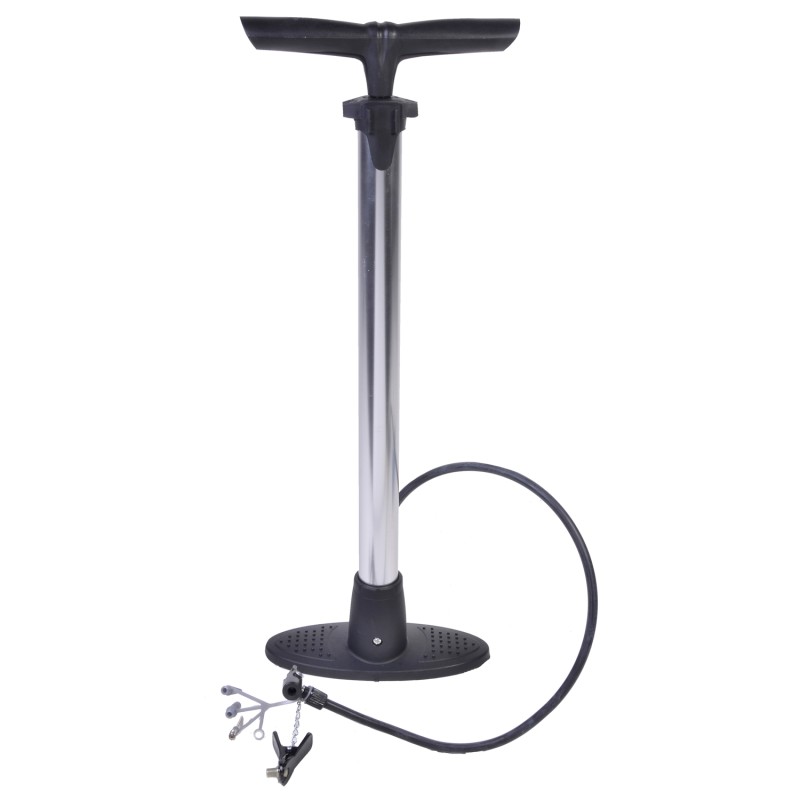 Висококачествена крачна помпа подходяща за планински и шосейни велосипеди с тънка основа от плътна пластмаса, здрав стоманен цилиндър и удобни противоплъзгащи дръжки с ергономичен дизайн.