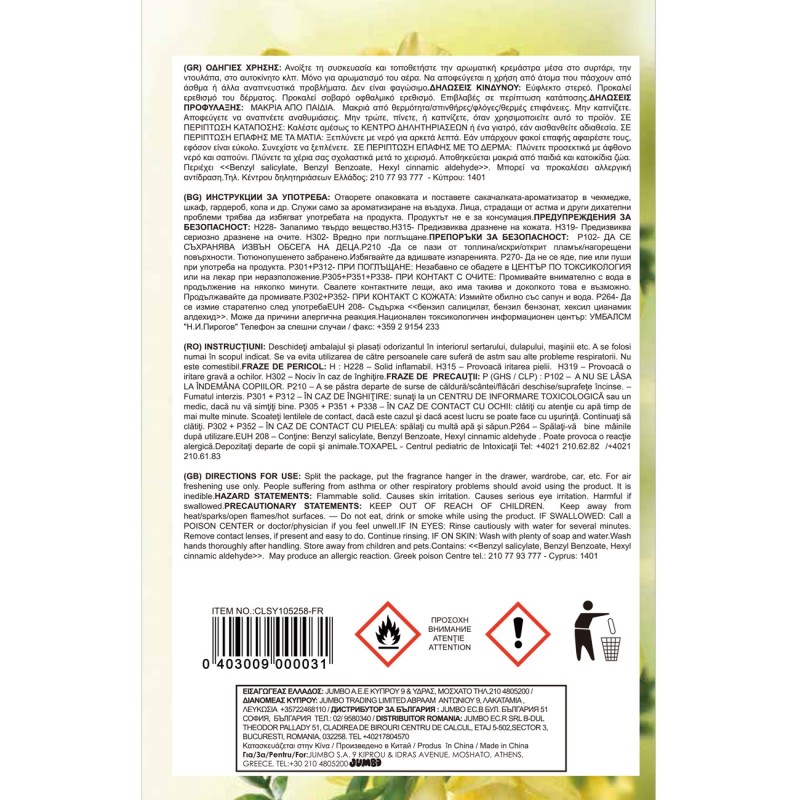 Предпазва дрехите, съхранявани в затворени помещения от неприятни миризми като същевременно им придават деликатен аромат на фрезия през целия сезон.
