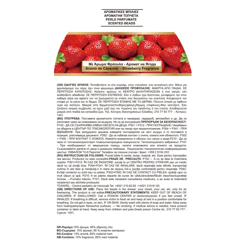 Ароматните топчета, с които е пълна торбичката предпазват дрехите, съхранявани в затворени помещения от неприятни миризми като същевременно им придават сладък аромат на ягода дълго време.