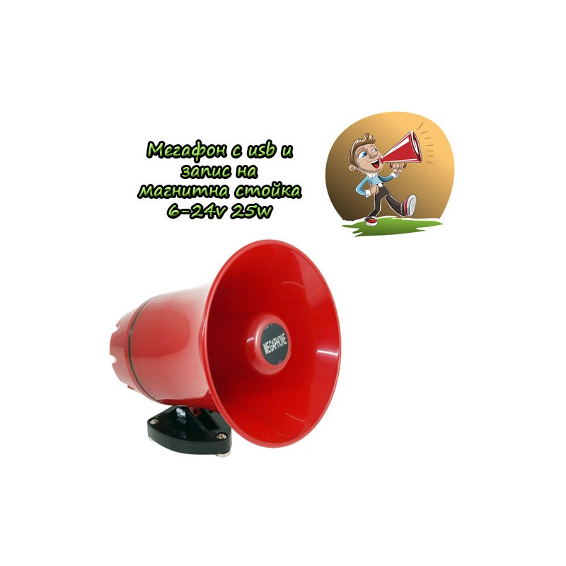 Идеален за монтаж на автомобили, пикапи и т.н., благодарение на 3-те мощни мини магнита. Съобщения могат да се записват или на вътрешната памет на мегафона, или на флашка и да се възпроизвеждат чрез USB порт.