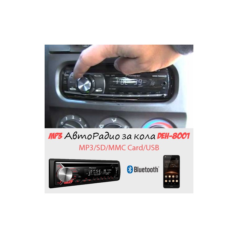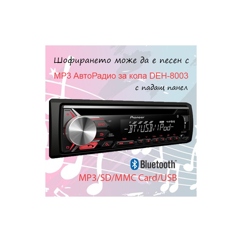 Радио плеъра DEH-8003 може да раноти като обикновено FM радио, с възможност за автоматично търсене и съхранение до 18 станции или като MP3 плеър. Можете да свържете USB памет или SD карта заредена с MP3 или WMA файлове, за да слушате любимата си музика, плюс информация за песента, която се показва на LCD екрана.