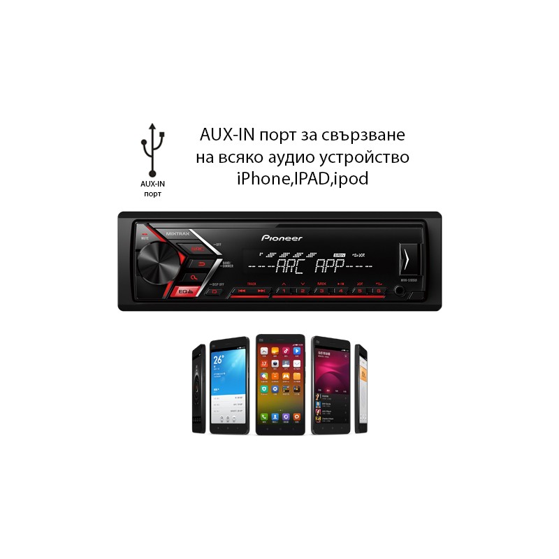 AUX-IN порт за свързване на всякакво аудио устройство, включително Ipod, iPhone, IPAD, както и всички 3.5mm аудио устройства- телефони, MP3, MP4, и т.н.