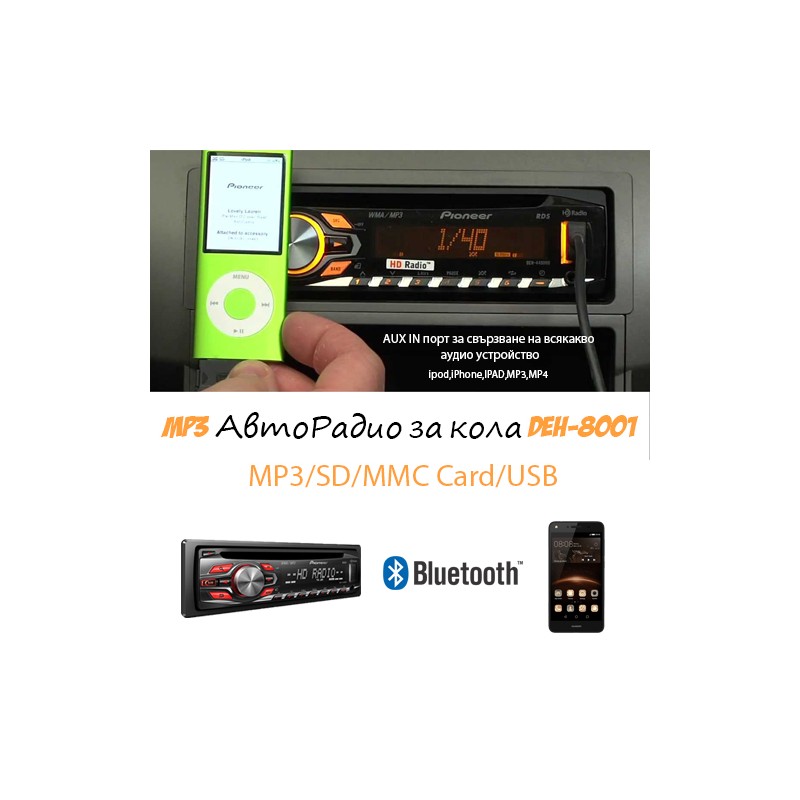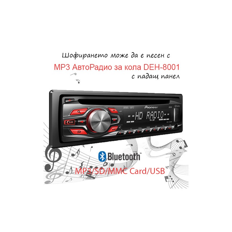 Радио плеъра DEH-8001 може да раноти като обикновено FM радио, с възможност за автоматично търсене и съхранение до 18 станции или като MP3 плеър. Можете да свържете USB памет или SD карта заредена с MP3 или WMA файлове, за да слушате любимата си музика, плюс информация за песента, която се показва на LCD екрана.