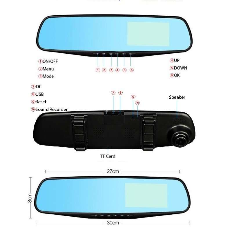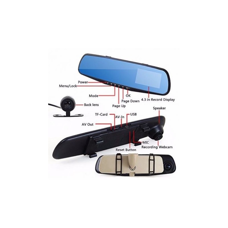 Често пъти нямате вина при дадено пътно-транспортно произшествие, но не можете да го докажете? Представяме Ви Висококачествено автомобилно огледало 4.3 инча с две камери Vehicle Blackbox DVR Full HD 1080P - Видеорегистратор вграден в огледалото и камера за задно виждане и паркиране. Благодарение на видеорегистратора можете да заснемате нарушители на пътя и съхранявате записи, които да послужат като доказателство на контролните органи. Устройството записва върху микро SD карта. Можете да правите видеозаписи и снимки с високо качество. С обхват до 170º градусовият широк ъгъл на предната камера осигурява максимална видимост на пътната обстановка пред Вас и снима и записва непрекъснато. Благодарение на задната камера, която се включва автоматично щом превключите на задна предавка, ще получите ясна и цялостна картина дори на случващото се зад автомобила.