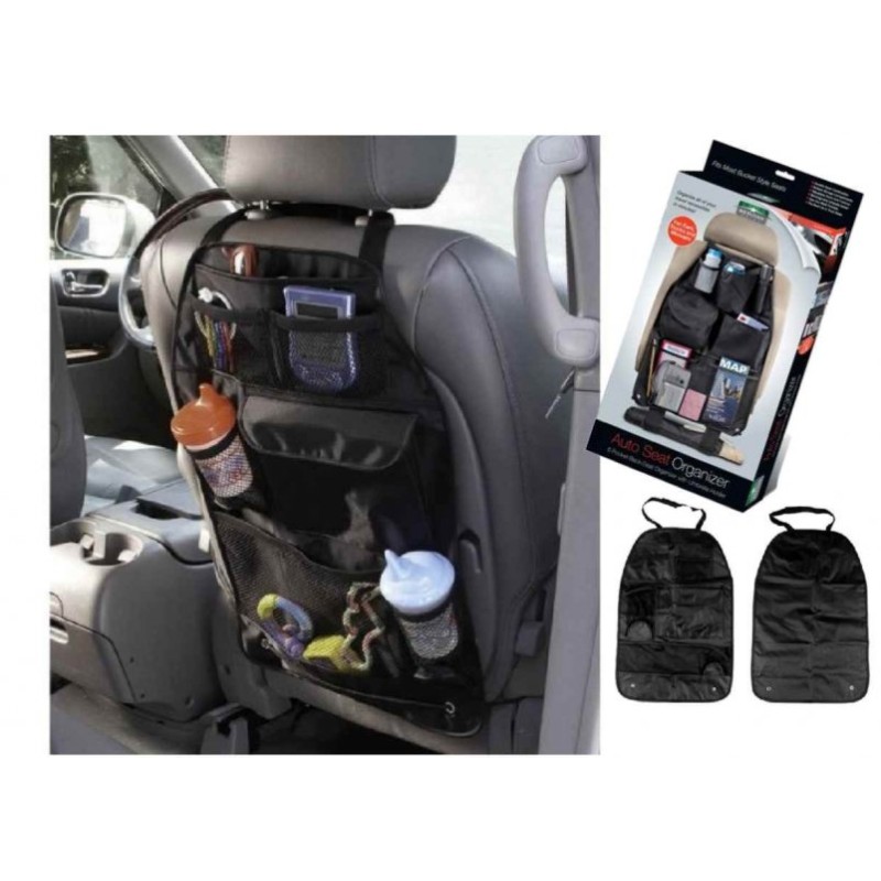 Решението е много просто – органайзер за автомобилна седалка. Слага се на гърба на предните седалки, като има регулируеми закрепващи ленти за приспособяване към всички видове седалки.