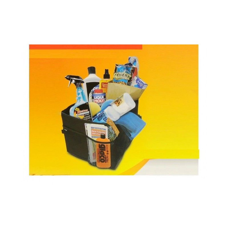 Практичен сгъваем органайзер за багажник - събира всички бутилки, имструменти и досадни джунджурии в багаажника на едно място. Разпъва се лесно, намества се в някой ъгъл и се пълни до откат. Залепва здраво за мокетените облицовки посредством лепенките "котешка лапа" на дъното. Има множество удобни отделения и джобчета, както и две дръжки, чрез които лесно се мести.