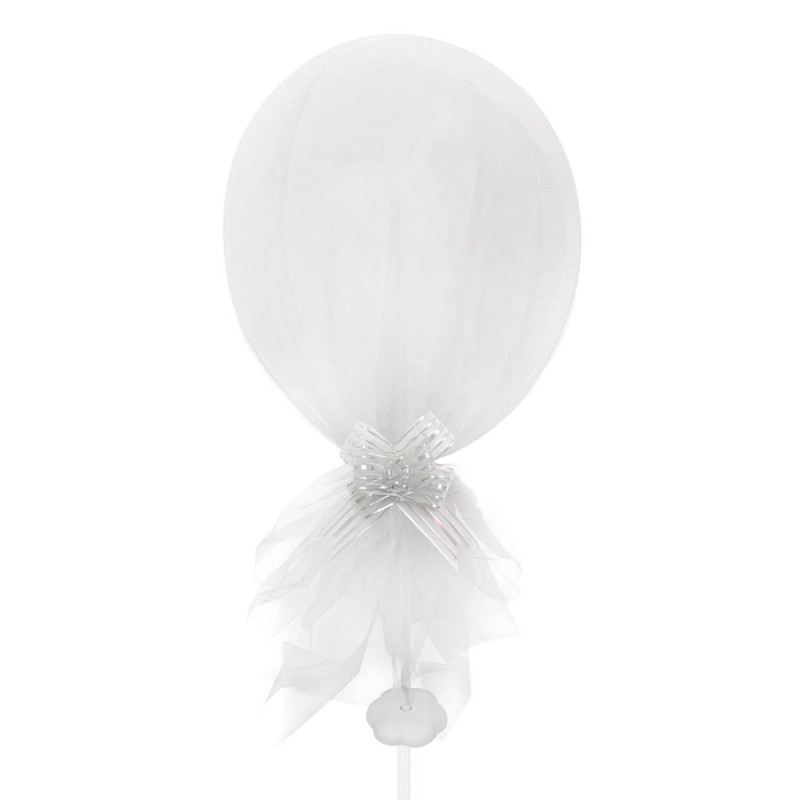 В комплекта са включени балон с диаметър 35 см., тюл 1.2 х 1.2 м., пластмасова дръжка 25 см., пластмасова основа и панделка от органза.