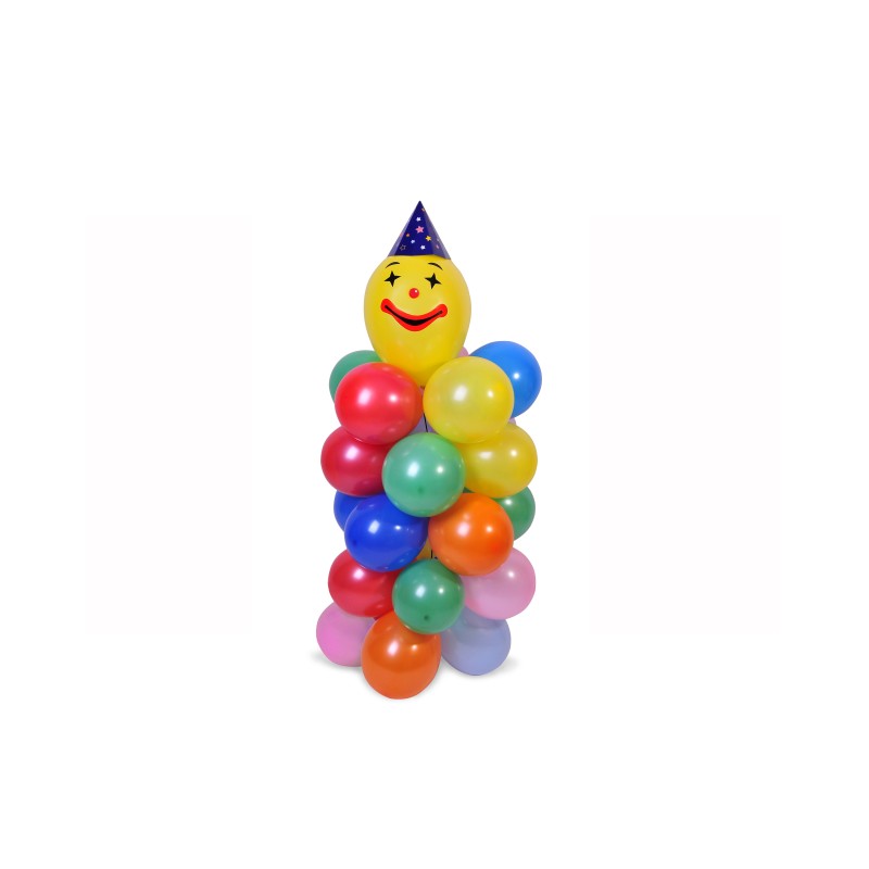 28 броя парти балони, изработени от латекс в различни ярки цветове в комплект със стикери и стойка (с височина 1 м.), за да направите фигура на клоун.