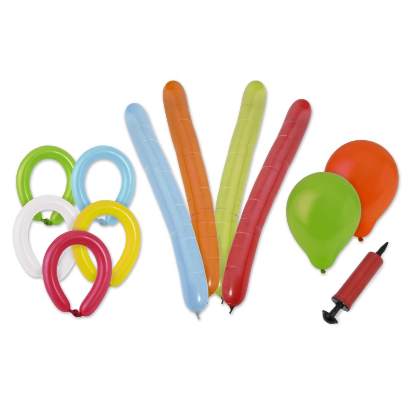 22 броя различни парти балони (10 бр. летящи, 10 бр. за моделиране на фигури и 2 бр. класически), изработени от латекс в ярки цветове в комплект с ръчна помпа.