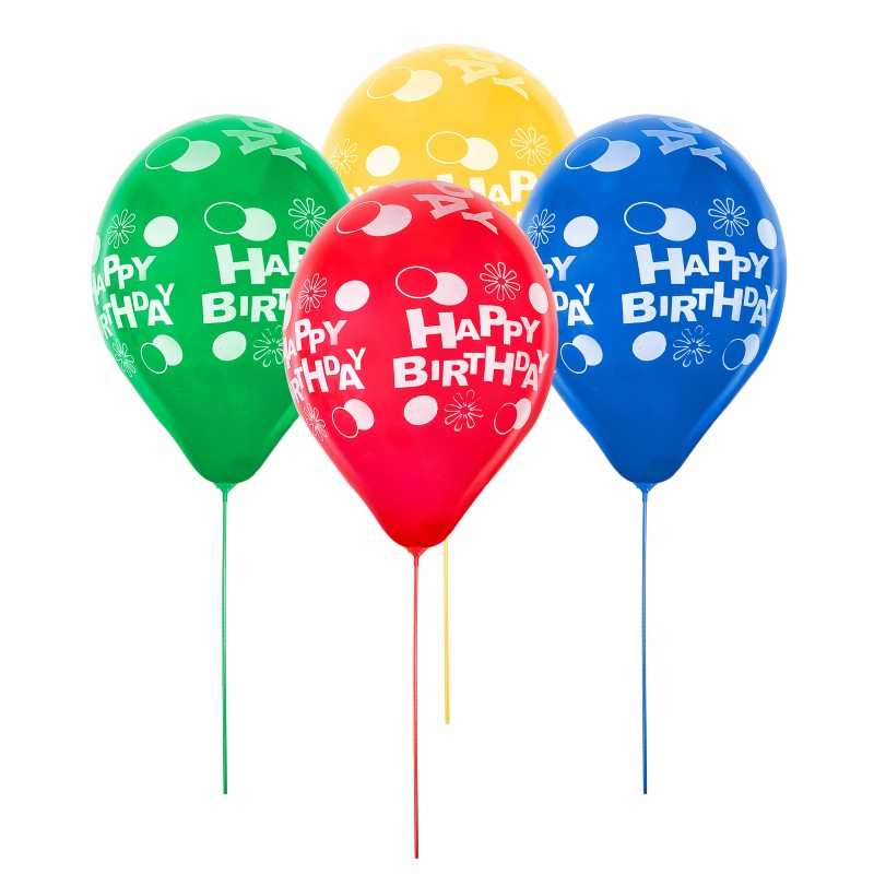 10 броя парти балони, изработени от латекс в различни ярки цветове с надпис Happy Birthday и дръжки с дължина 38 см.