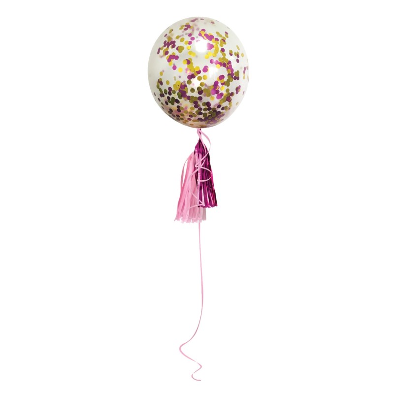 Парти балон, изработен от прозрачен латекс с розови и златисти конфети вътре и декоративни пискюли.