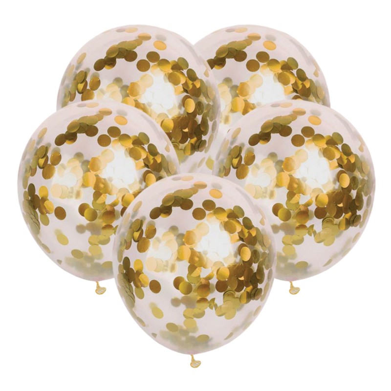 5 броя парти балони, изработени от прозрачен латекс със златисти конфети вътре.