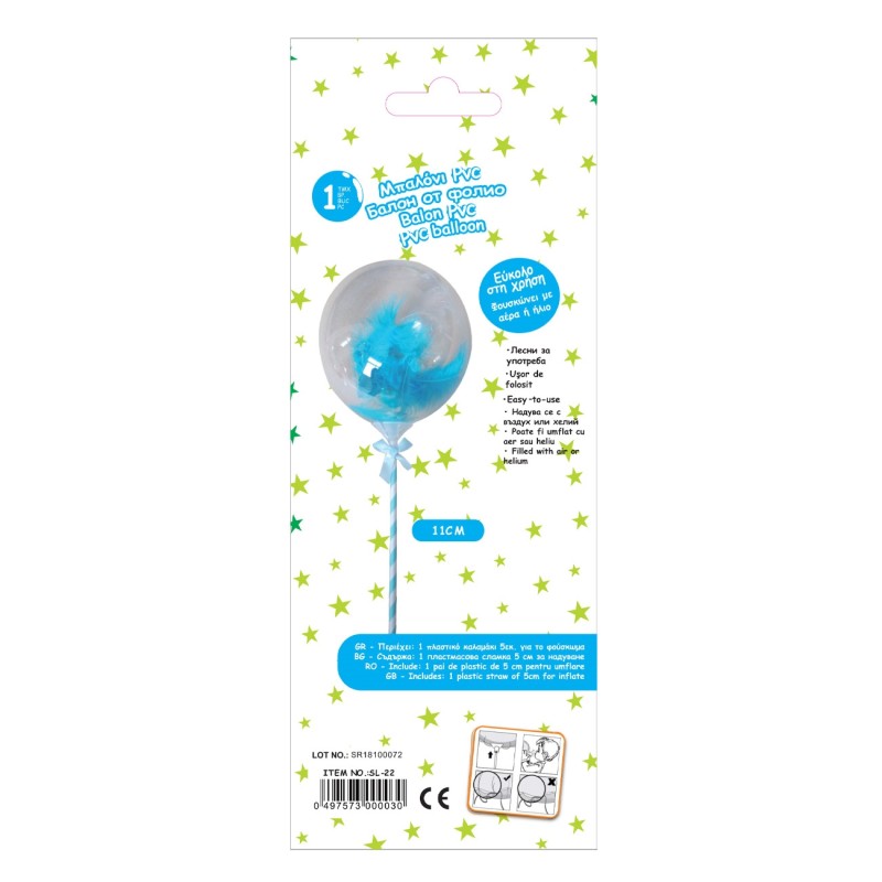 Парти балон, изработен от прозрачен PVC материал със сини пера вътре.