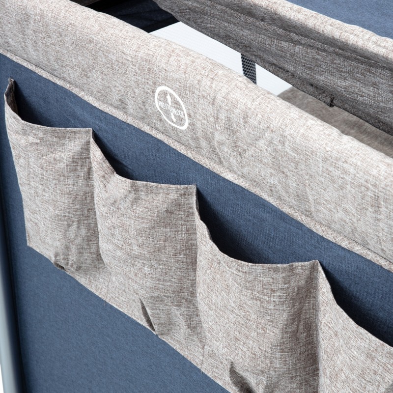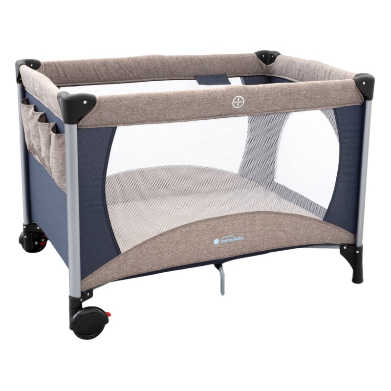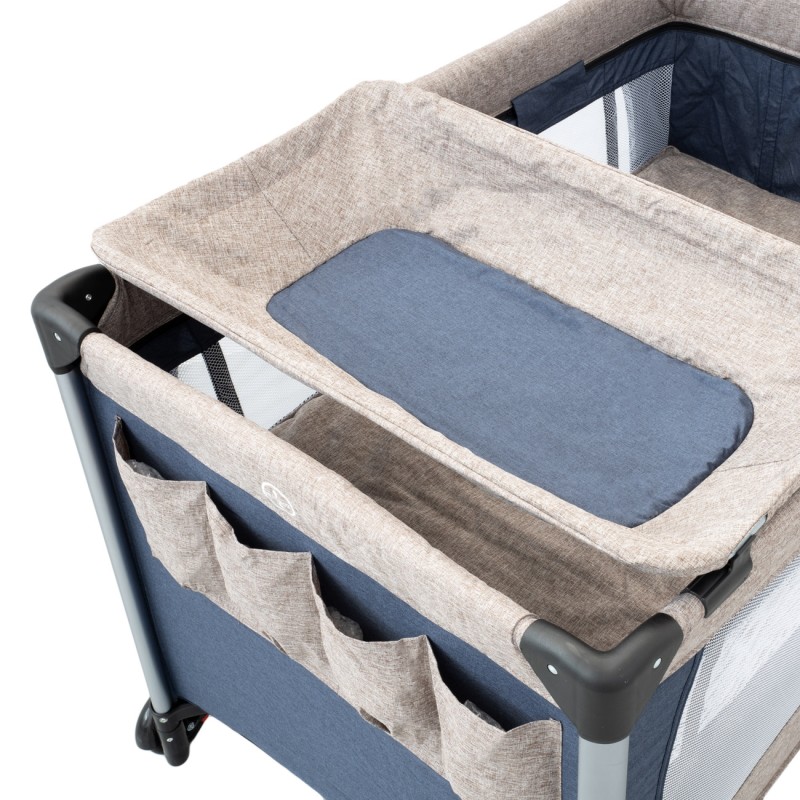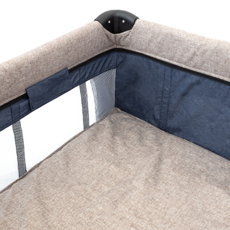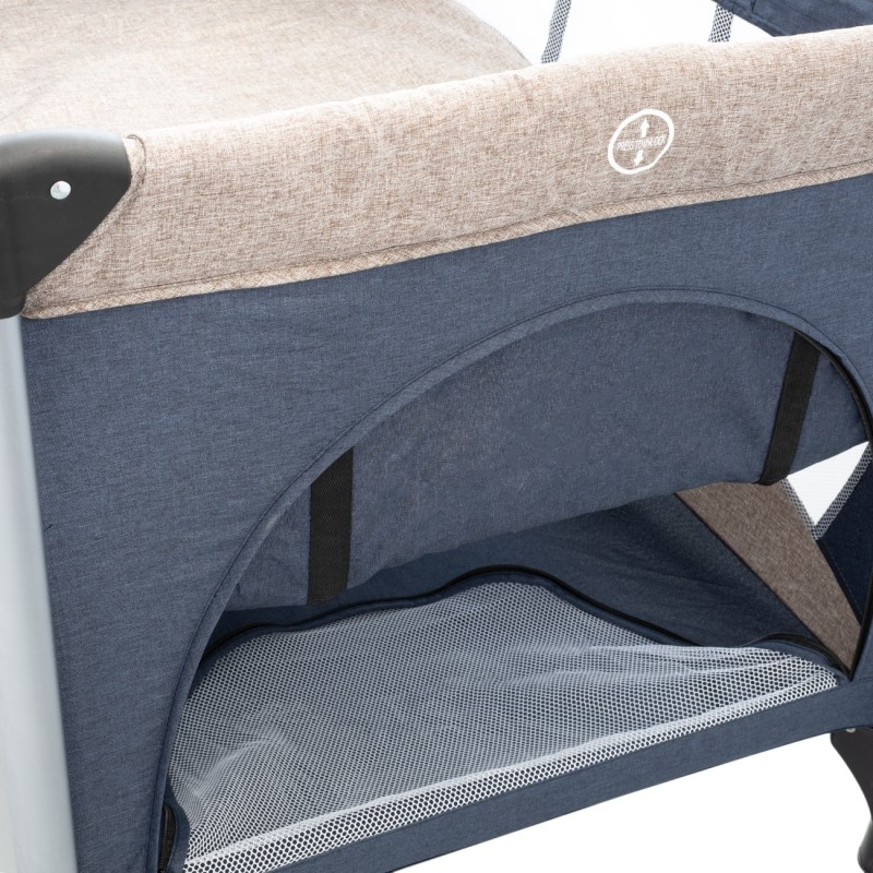 Голяма и стабилна бебешка кошара в синьо и бежово с регулируема височина на матрака.