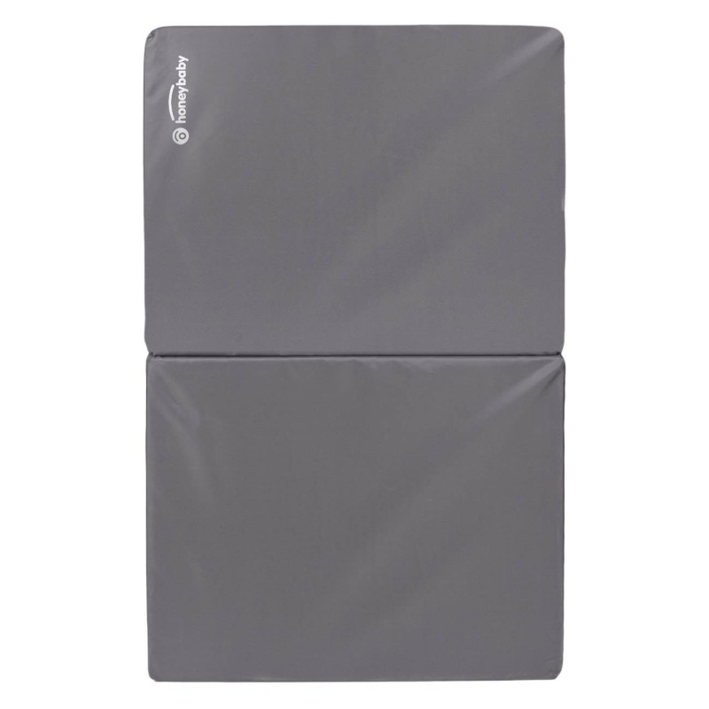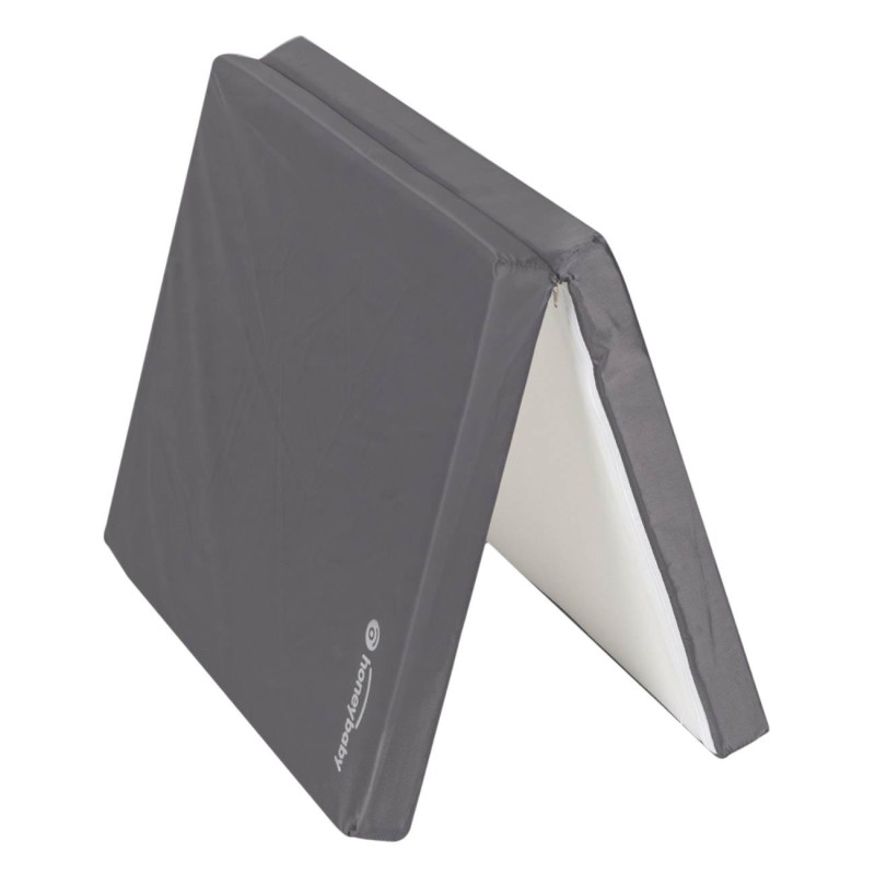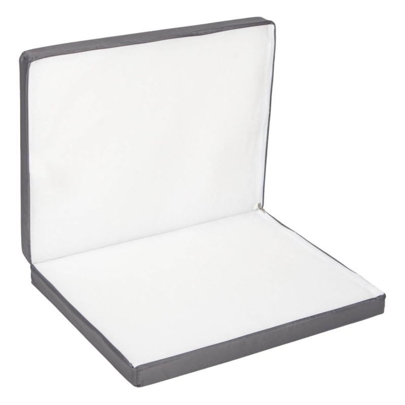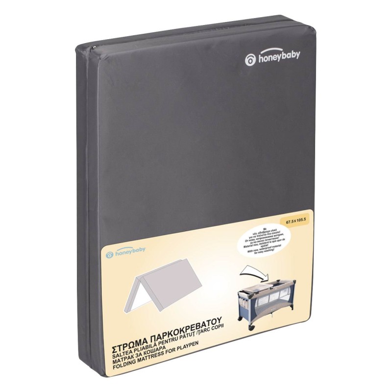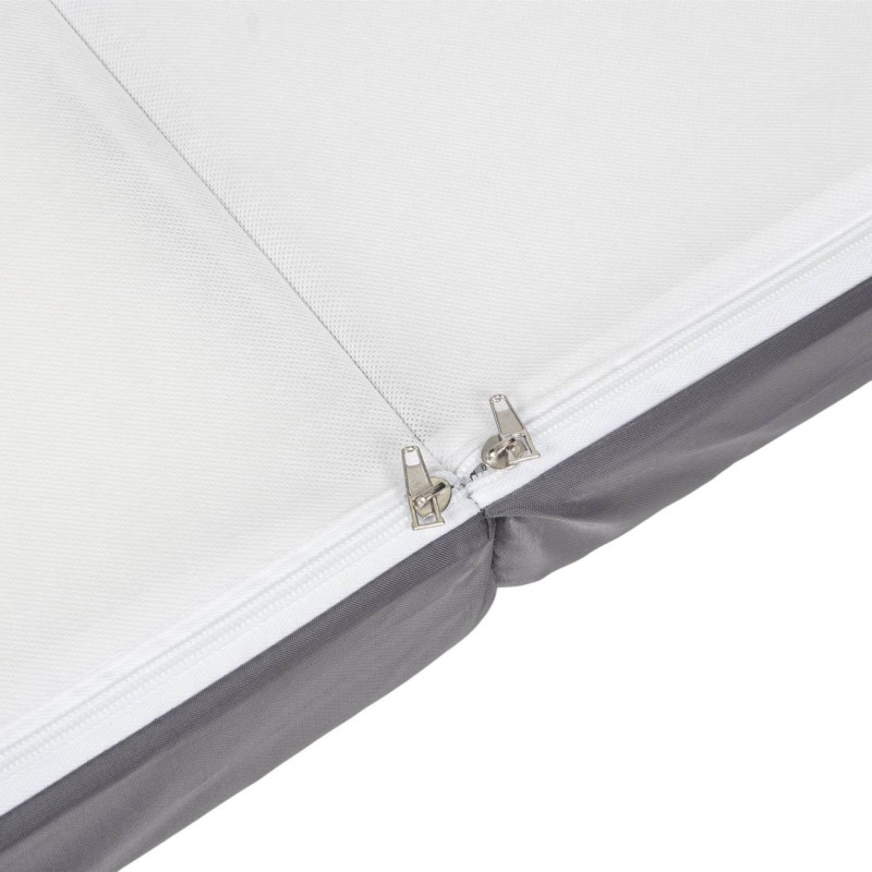 Практичен бебешки матрак за детски сгъваеми кошари и дървени легла, изработен от полиестер с калъф от нова непромокаема материя в сиво и бяло за по-лесно почистване.