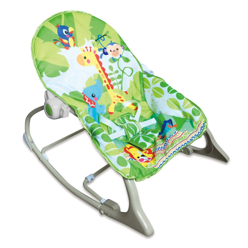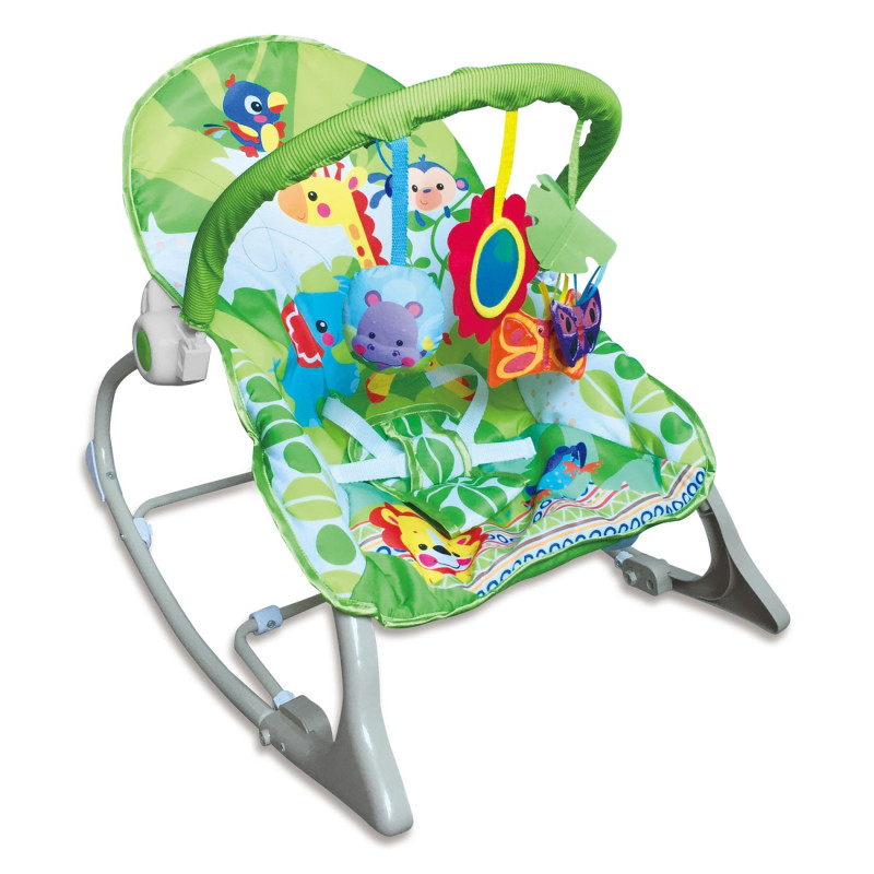 2 в 1 проходилка-люлка, изработена от здрава и качествена пластмаса с мека възглавничка от полиестер в зелен цвят с щампа на животни и подвижна лента с играчки животни и цветя.