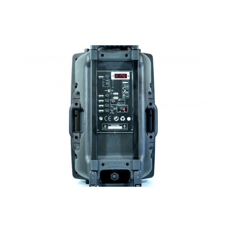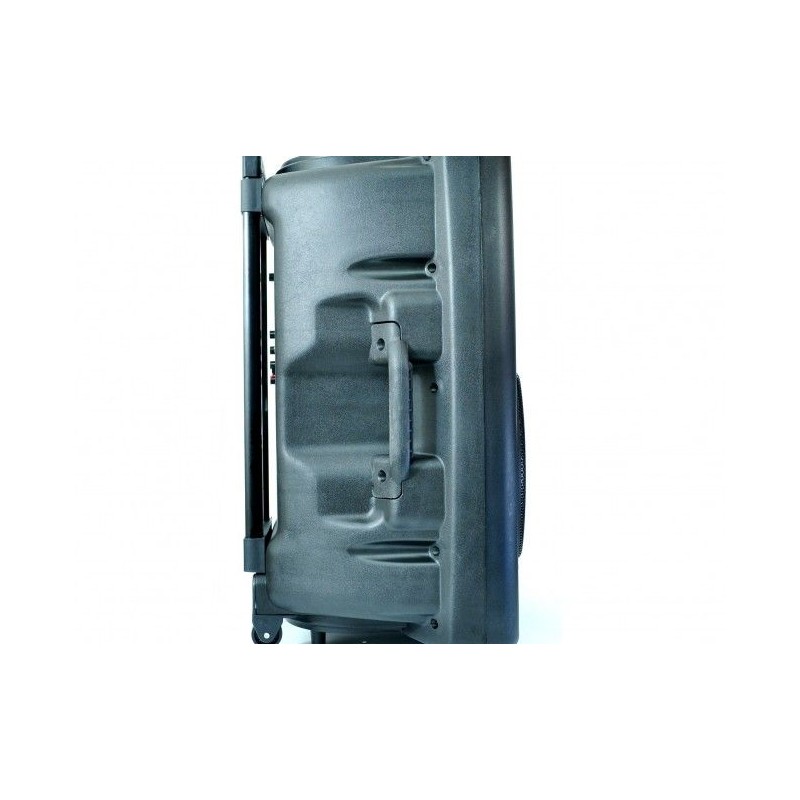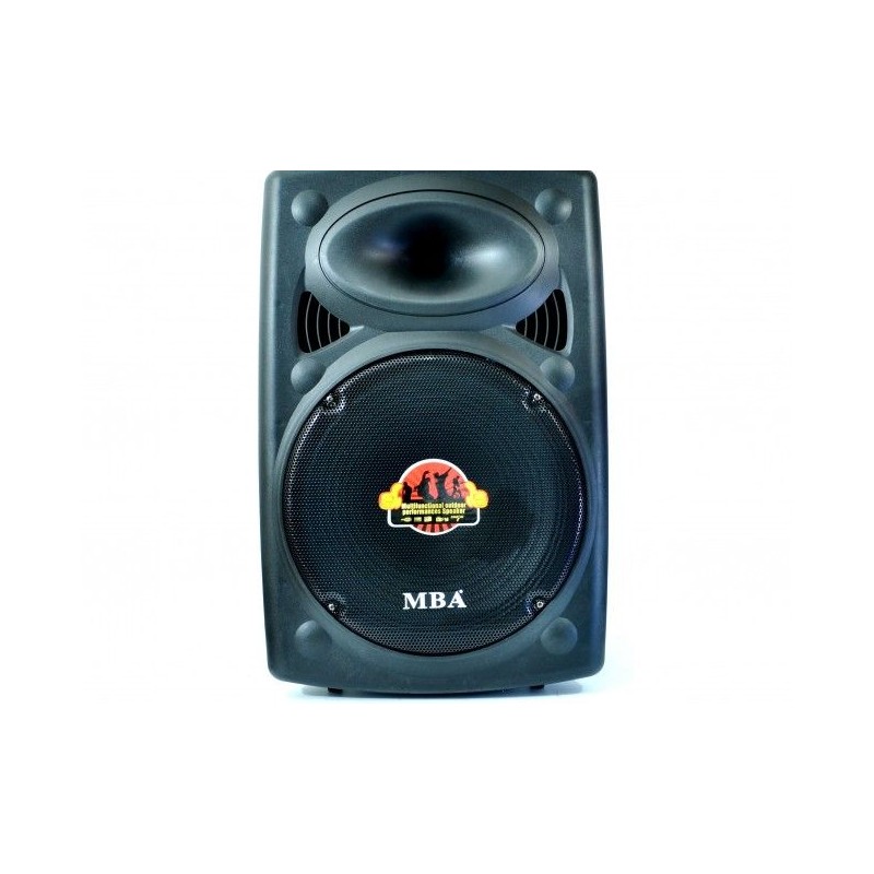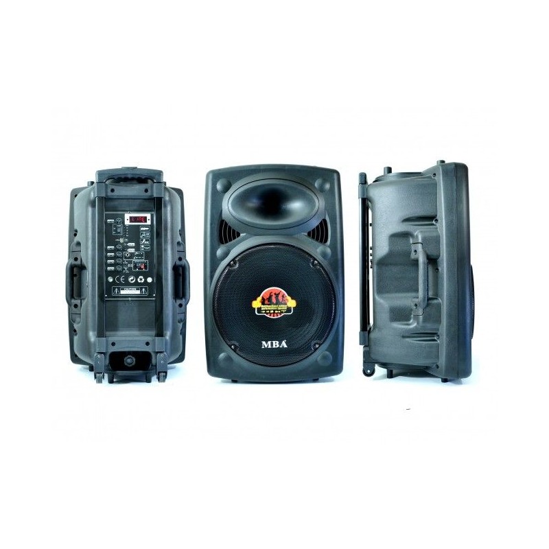 Мощна активна караоке система MBA W15, 700W, 270W RMS, с 2 безжични микрофона, FM, MP3, BLUETOOTH и много екстри. DJ вече не зад пулта, а на открито, дори и сред природата, далеч от всякаква електрическа мрежа. MBA W15 e мощна акумулаторна аудио система с пълна функционалност на професионален DJ пулт, експлозивна мощност и HiFi качество на звука. Уредбата възпроизвежда MP3 директно от USB Flash, карта памет SD или от телефон посредствон блутут връзка. Малкият дигитален дисплей показва честота на станция или номер на възпроизвежданата песен / файл. Вградени два мощни високоговорителя, радио, дистанционно, акумулатор, безжичен микрофон и МР3 плейър - от SD карта или флашка. Караоке тонколоната MBA W15 е особено подходяща за улични музиканти, купони, празненства, презентации и др. Системата за караоке е много удобна и за ползване на места където няма електричество, тъй като е с вграден мощен акумулатор.