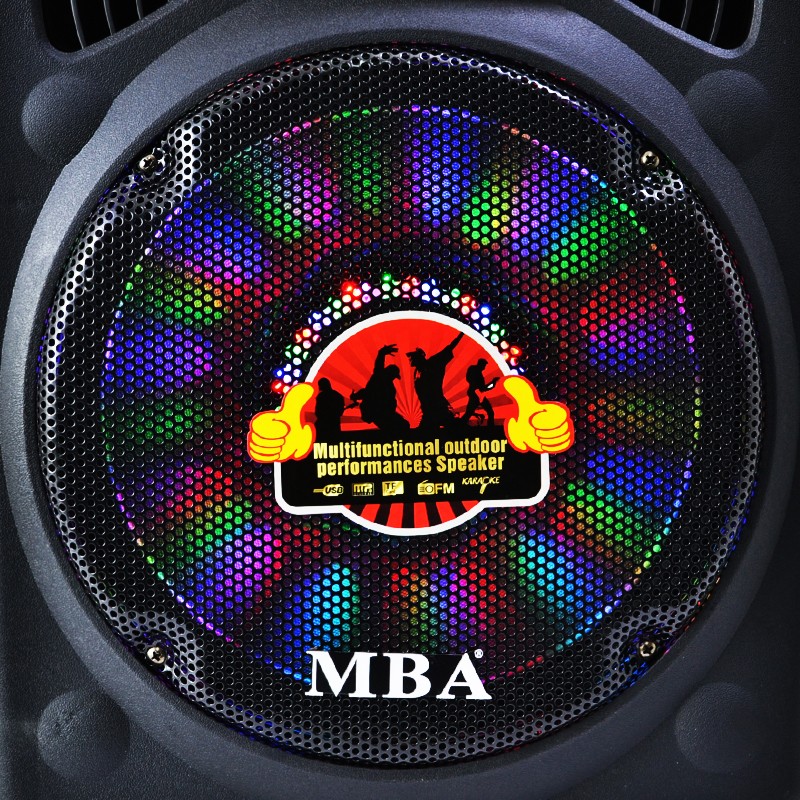 Мощна активна кареоке система MBA F12Q 500W, 160W RMS с LED светлини и два безжични микрофона за озвучаване на всякакви събития, сватби, събори. DJ вече не зад пулта, а на открито, дори и сред природата, далеч от всякаква електрическа мрежа. MBA F12Q e мощна акумулаторна аудио система с пълна функционалност на професионален DJ пулт, експлозивна мощност и HiFi качество на звука. Уредбата възпроизвежда MP3 директно от USB Flash, карта памет SD или телефон/таблет посредством блутут връзка.