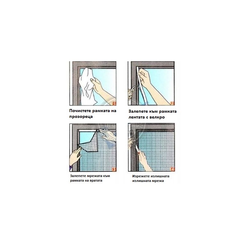 Начин на поставяне: Монтира се за 1 минута с помощта на залепяща се велкро лента, която позволява многойкратното и лесно премахване на мрежата. Използвайте велкро залепящата лента за монтажа. Отлепете предпазното фолио на лентата и залепете за дограмата. След това поставете оразмерената мрежа върху лентата.