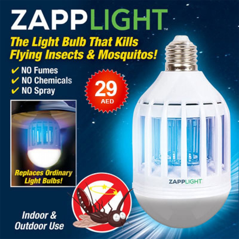 ZAPPLIGHT: LED крушка 9W=60W с вграден UV унищожител на комари и вредители. В крушката е вграден излъчвател на ултравиолетова светлина, който превлича неудържимо комарите и другии летящи вредители и ги унищожава на място. Уникално инженерно решение 2в1 - LED крушка и унищожител на вредители с постоянно действие.