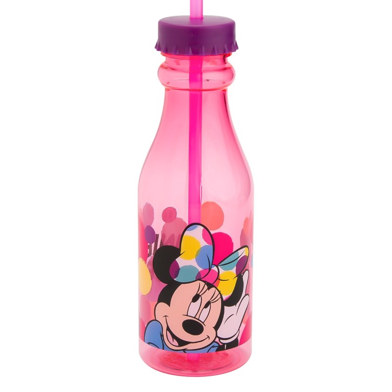 Детска бутилка, изработена от плътна и устойчива прозрачна пластмаса в розов цвят с щампа на Мини Маус, лилава капачка и сламка.