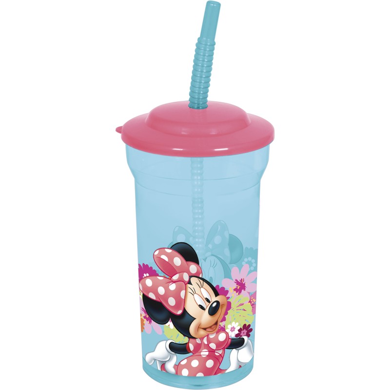 Детска чаша, изработена от плътна и устойчива прозрачна пластмаса в светло син цвят с щампа на Мини Маус, розов капак и сламка.