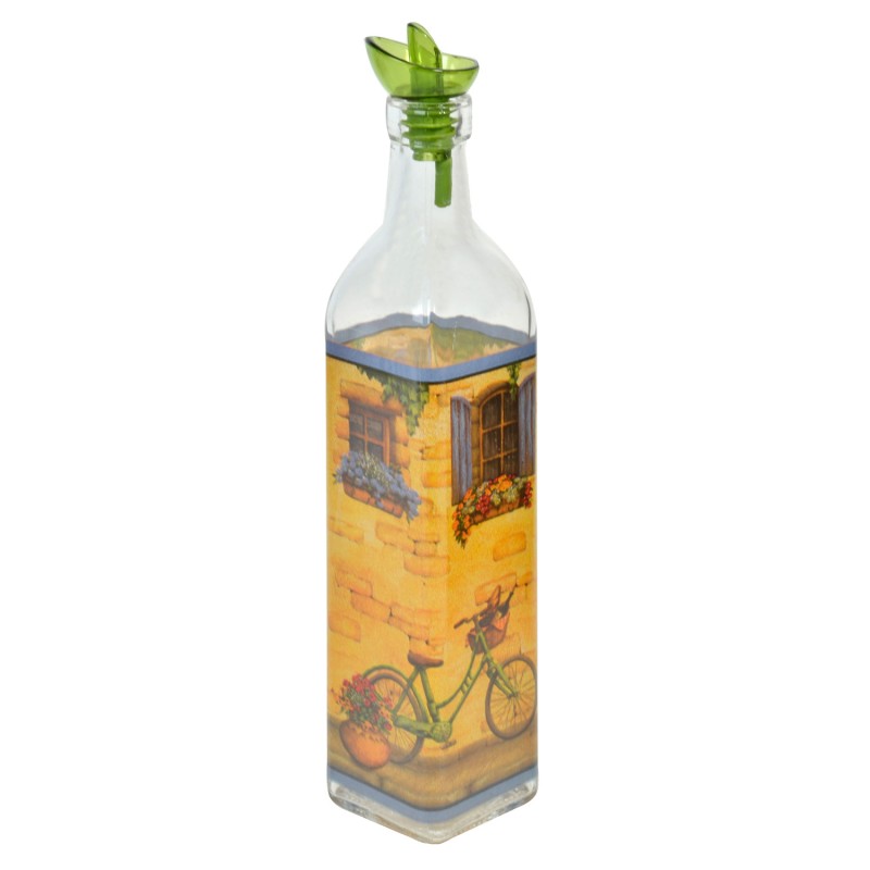 Прозрачна стъклена бутилка за съхранение на олио или зехтин с винтидж щампа на велосипед и наливник със запушалка. Перфектна за бързо и лесно овкусяване на салати, паста и риба.
