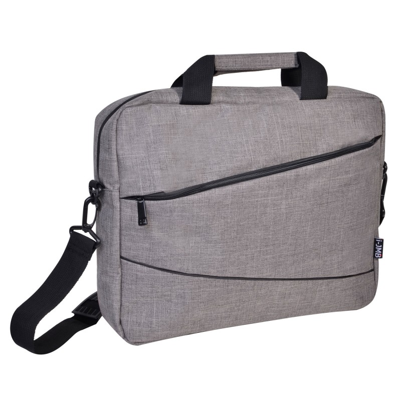 Чанта за лаптоп в сиво с вътрешни отделения и външен джоб с цип.
