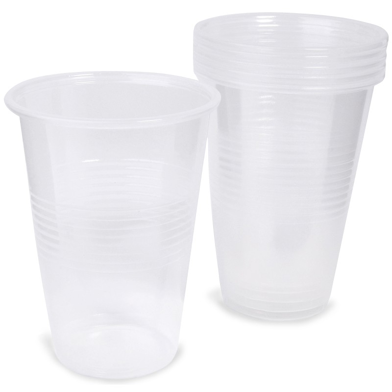 20 броя водни чаши за еднократна употреба, изработени от прозрачна пластмаса.