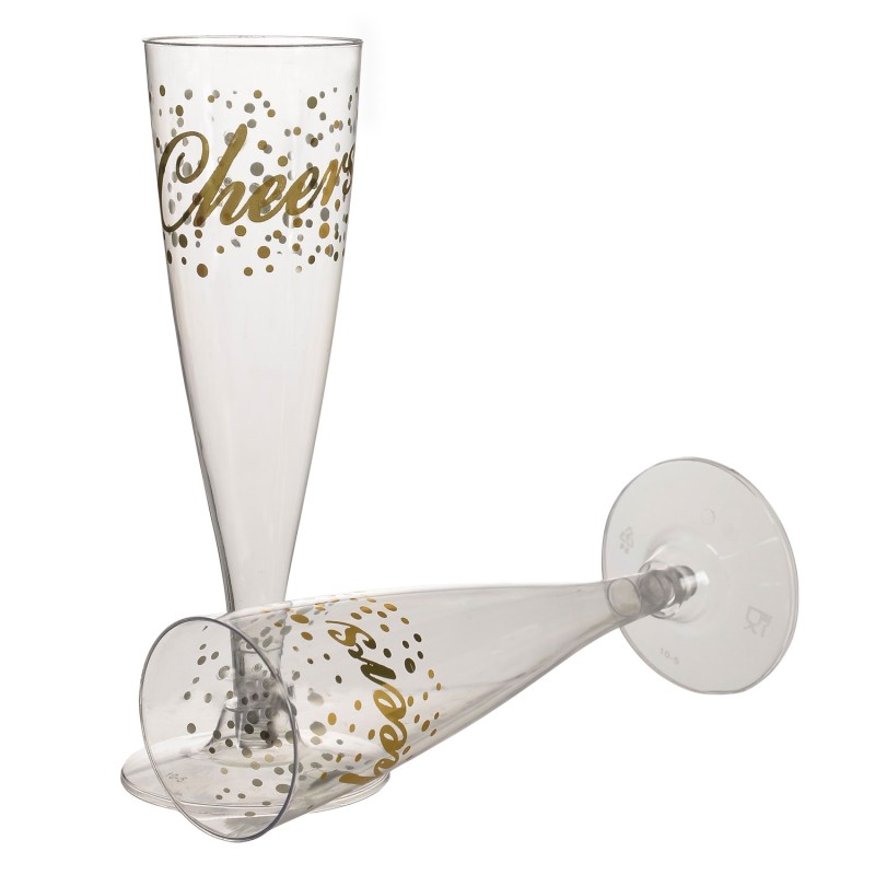 Комплект от 6 броя чаши за шампанско за еднократна употреба, изработени от прозрачна пластмаса с декоративни златисти точки и надпис Cheers.
