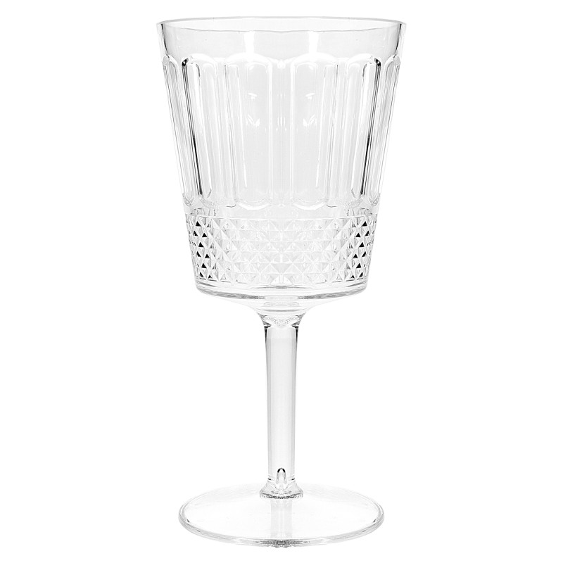 Чаша за вино със столче, изработена от качествена прозрачна пластмаса с декоративни релефни шарки.