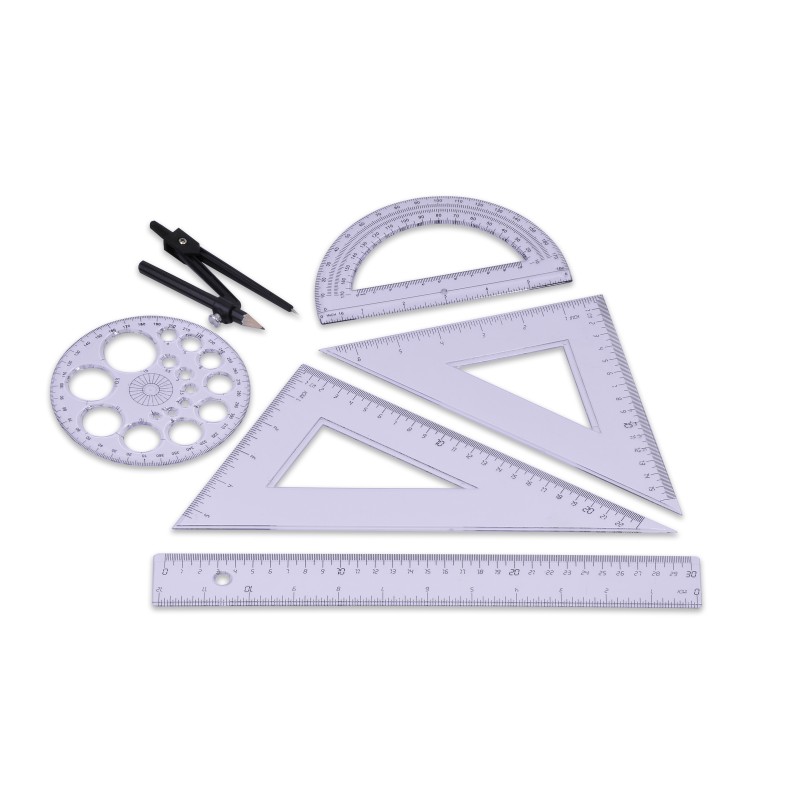 Чертожен комплект включващ линия с дължина 30 см. / 12 инча, разностранен правоъгълен триъгълник (23 см.), равностранен правоъгълен триъгълник (16 см.), транспортир, пергел с молив и инструмент за чертане на окръжности с различни размери, изработени от пластмаса.