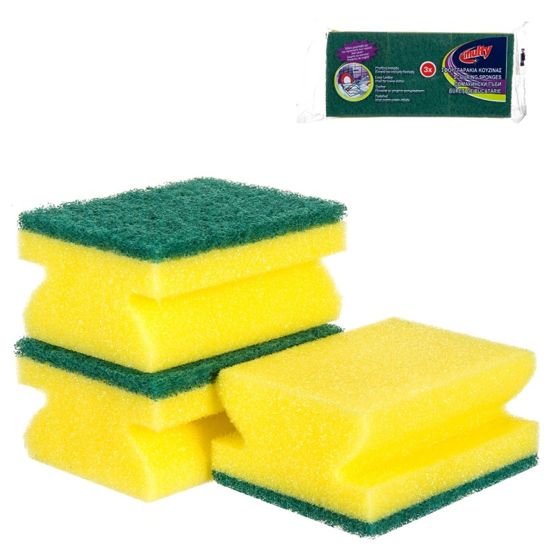Комплект от 3 броя домакински гъби за почистване на съдове и различни повърхности в кухнята или банята.