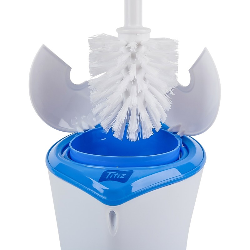 Комплект за тоалетна, състоящ се от четка и поставка с автоматичен капак, който се отваря и затваря при изваждане и поставяне на четката.