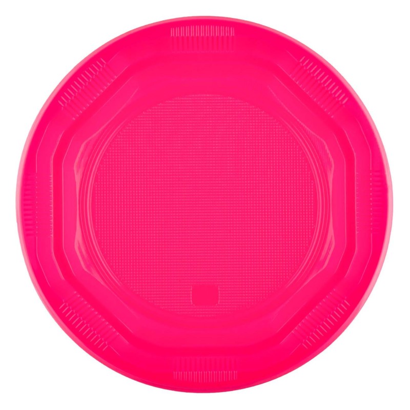 Комплект от 8 броя чинии за еднократна употреба с кръгла форма, изработени от пластмаса в цикламен цвят.